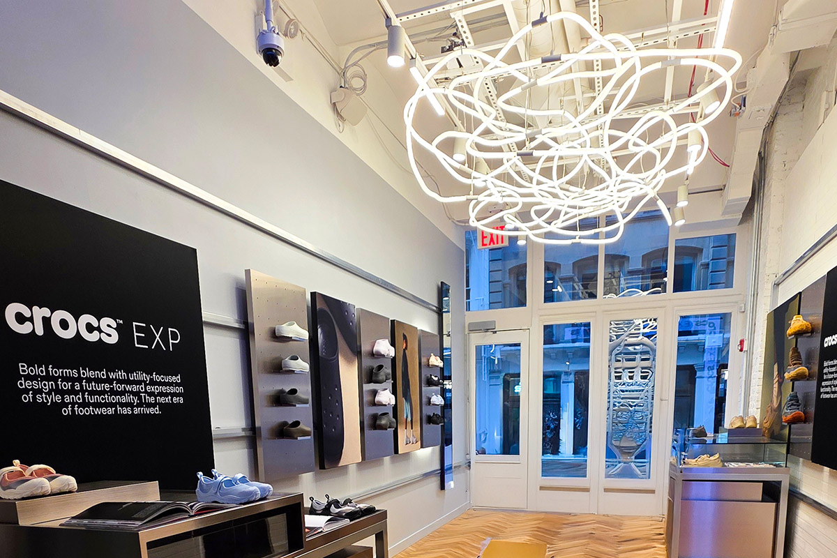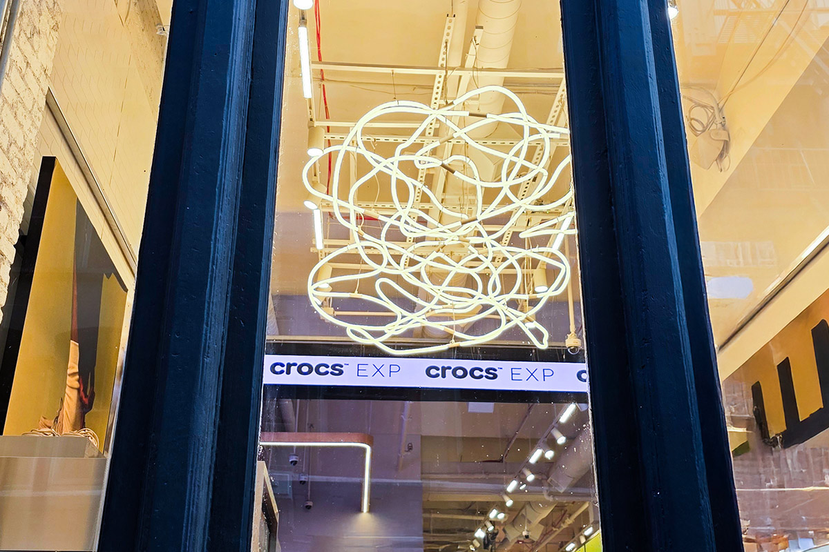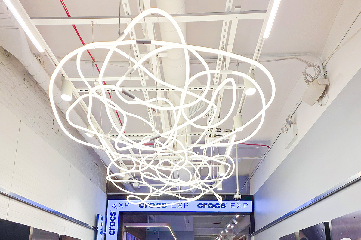 The custom lighting installation brings an unmistakable energy to the Crocs SoHo flagship store, transforming a simple lighting element into an expressive sculptural feature.